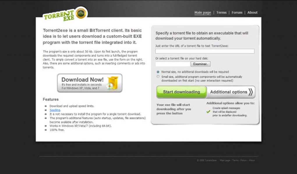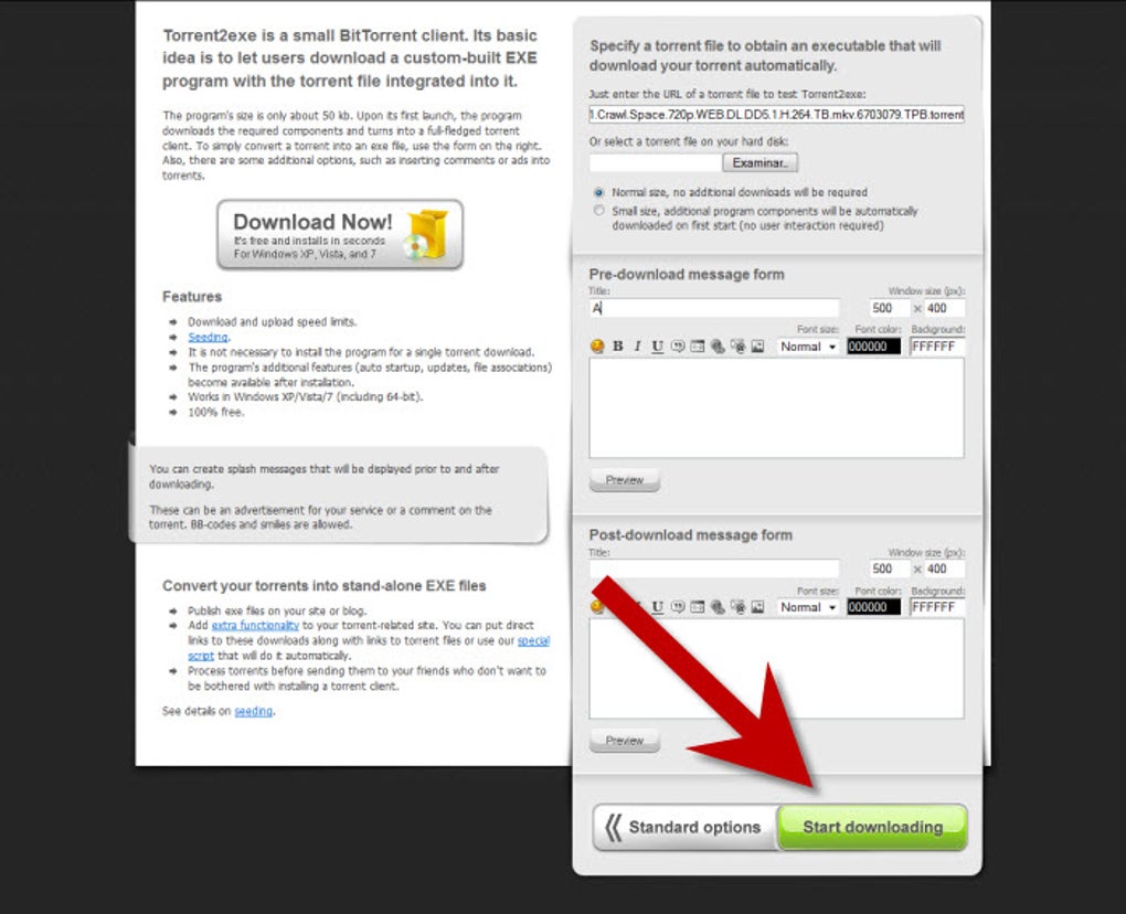 Al hacer clic en "Start Download!" podrás bajar un archivo EXE totalmente seguro, que se encargara de la descarga de los archivos deseados. Torrent2exe también configura este gestor para que arranque al iniciar Windows.